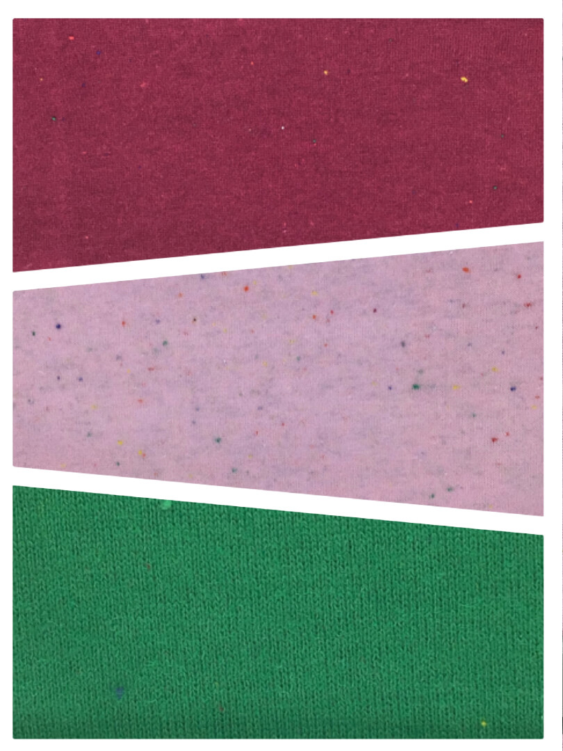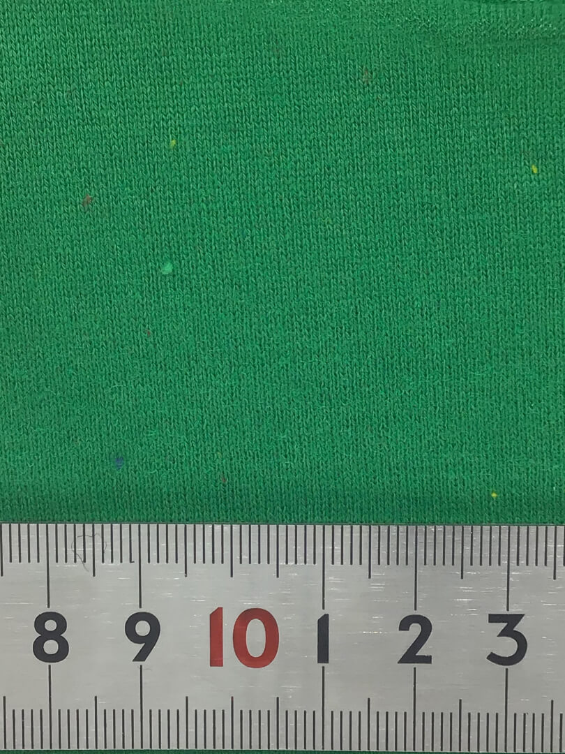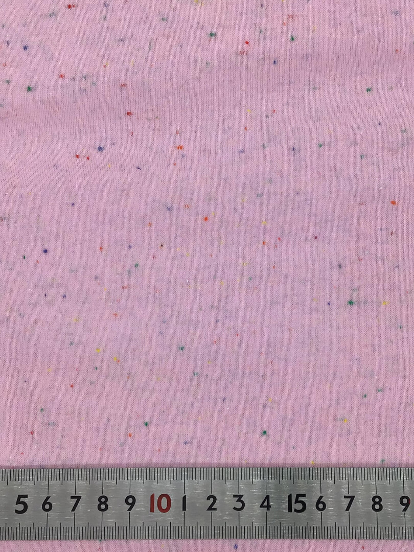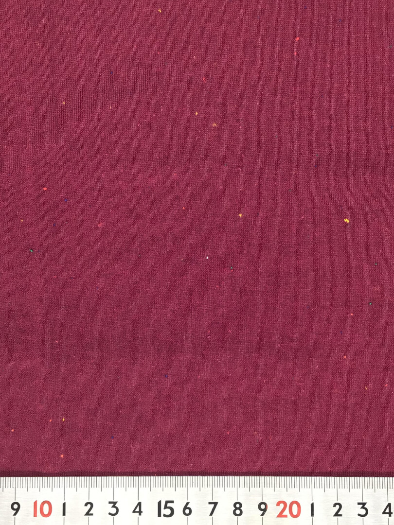 5、6色のカラーネップを含む天竺です。テンションはやや高め、肉厚はやや薄いためTシャツやカーディガン向きです。 1m 418円の生地です。