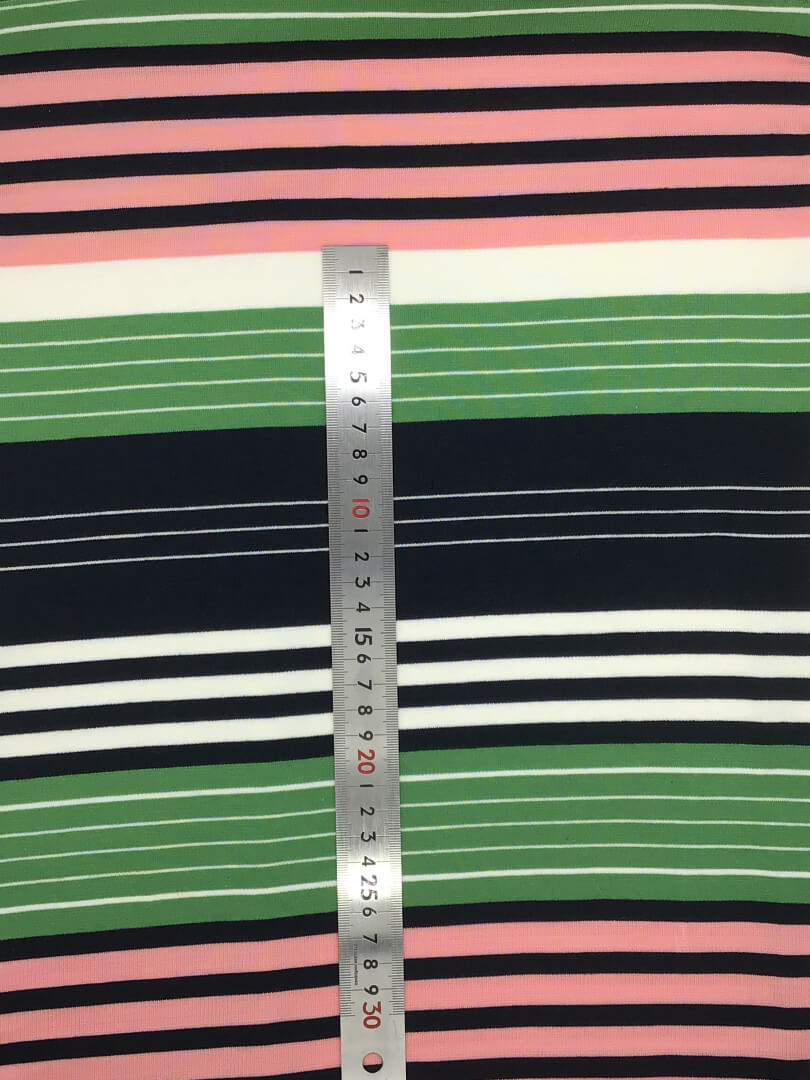 ボーダー柄の30/スムースです。テンションはやや高め、肉厚は中程度です。Tシャツや子供服、ペットウェアに向いています。 1m 418円の生地です。